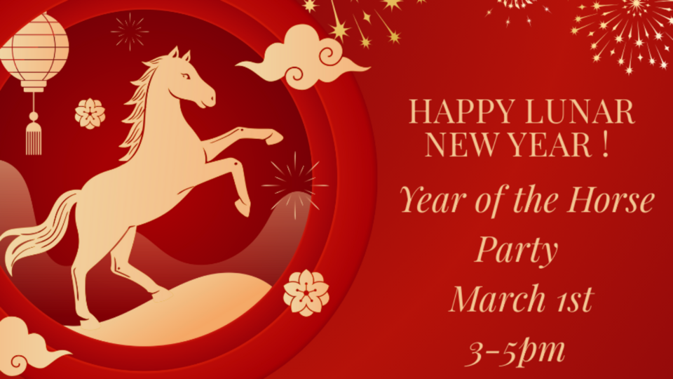 Free party event to celebrate the Lunar New Year of the Fire Horse. We'll have lucky foods to share and a pineapple cake (the color of gold!). Then Nikki will brake it all down for us, what is the Year of the Horse all about. Please register so we have an idea of what to prepare.